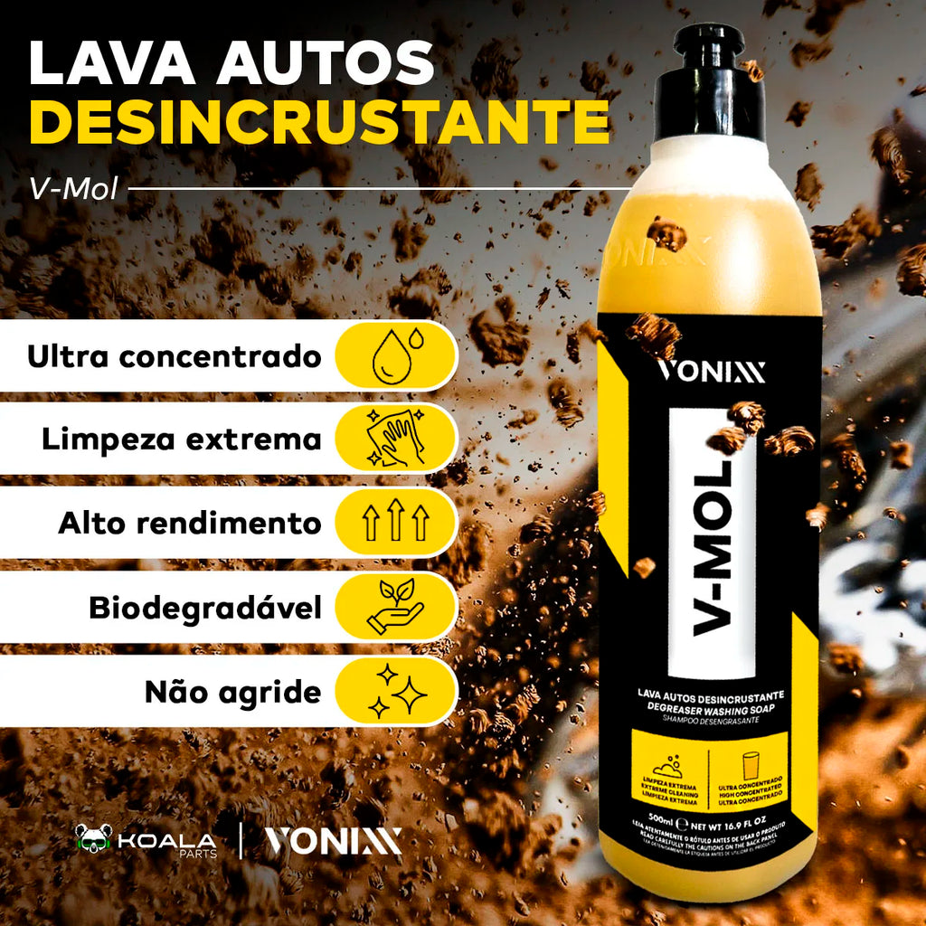 O V-Mol Vonixx é um desincrustante automotivo de alto desempenho , desenvolvido para remover até as sujeiras mais difíceis sem danificar a pintura, plásticos ou superfícies sensíveis .